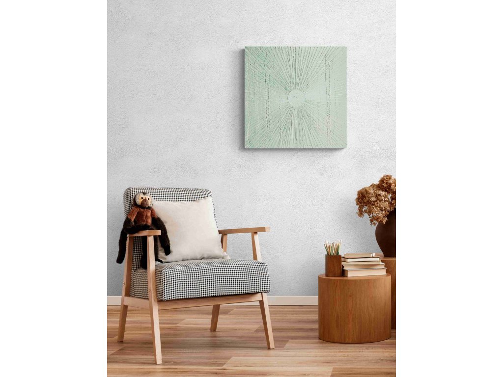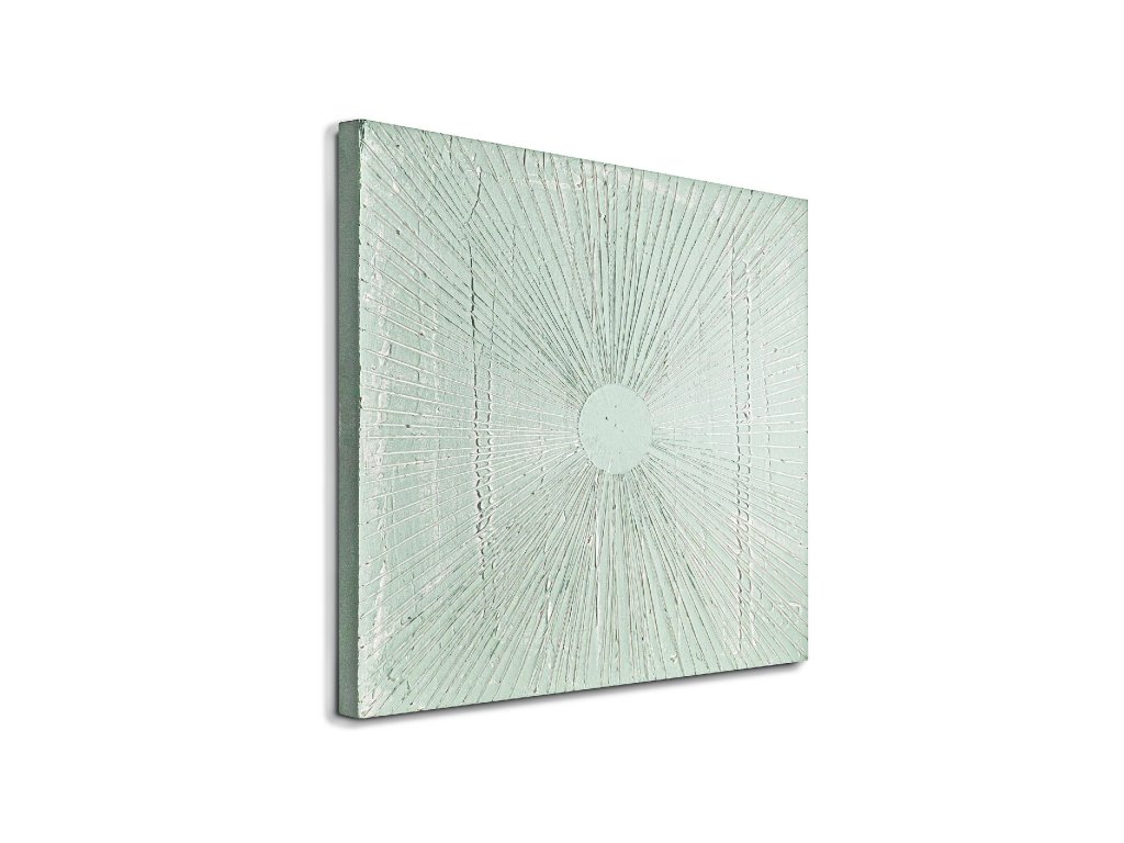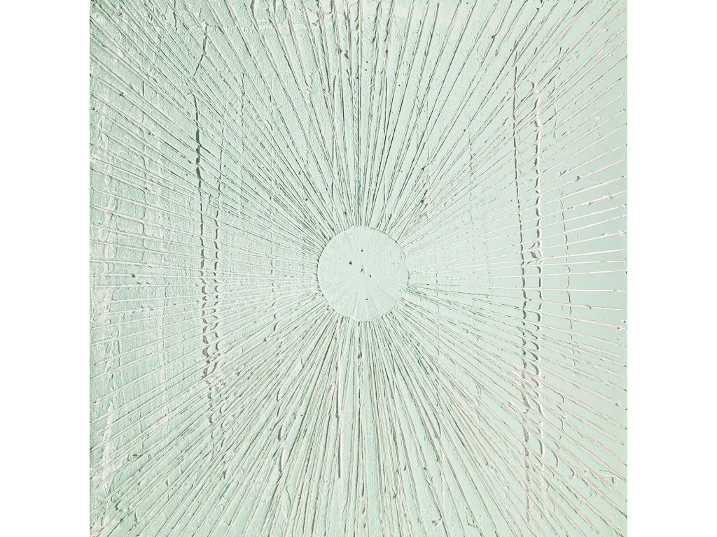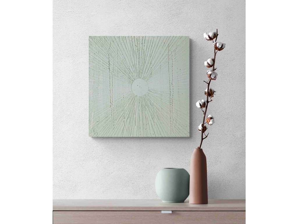 Travi azzurro (50x50) je středním z nabízených velikostí. Světle modře zbarvená kompozice je tvořena hustými paprsky ze středového hladkého kruhu napodobující sluneční záři.